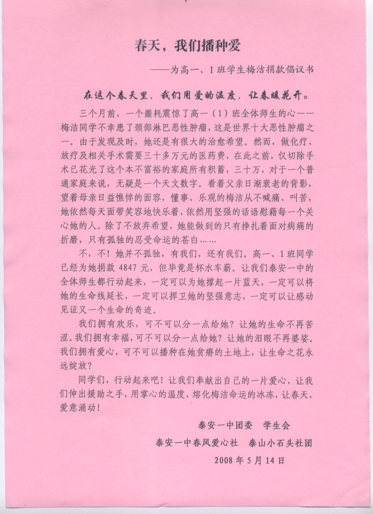 春天,我们播种爱--为高一、1班学生梅洁捐款倡议书